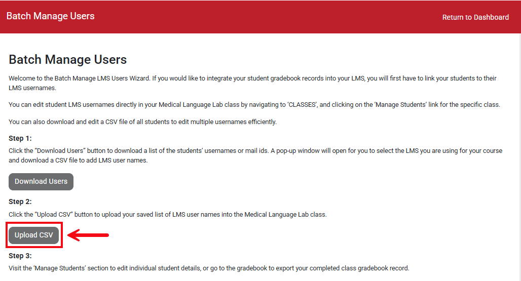 Return to the Medical Language Lab Batch Manage Wizard. Select Upload CSV, to bring up the Upload LMS Username popup.