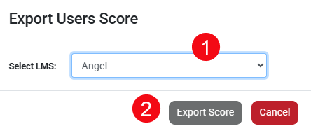 Select your preferred format from the Select LMS dropdown menu (1). Then, click Export Score (2) to download a spreadsheet version of your Gradebook in your chosen format.