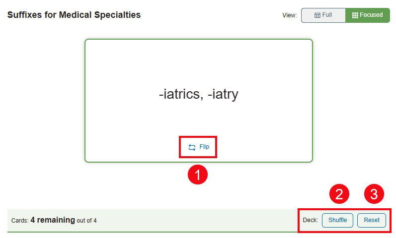 In the Focused view, use the Flip option to flip the flashcard (1). The Shuffle option (2) shuffles the terms rather than keeping them in the order found in the Full view. The Reset option (3) will allow you to move through the flash cards again.